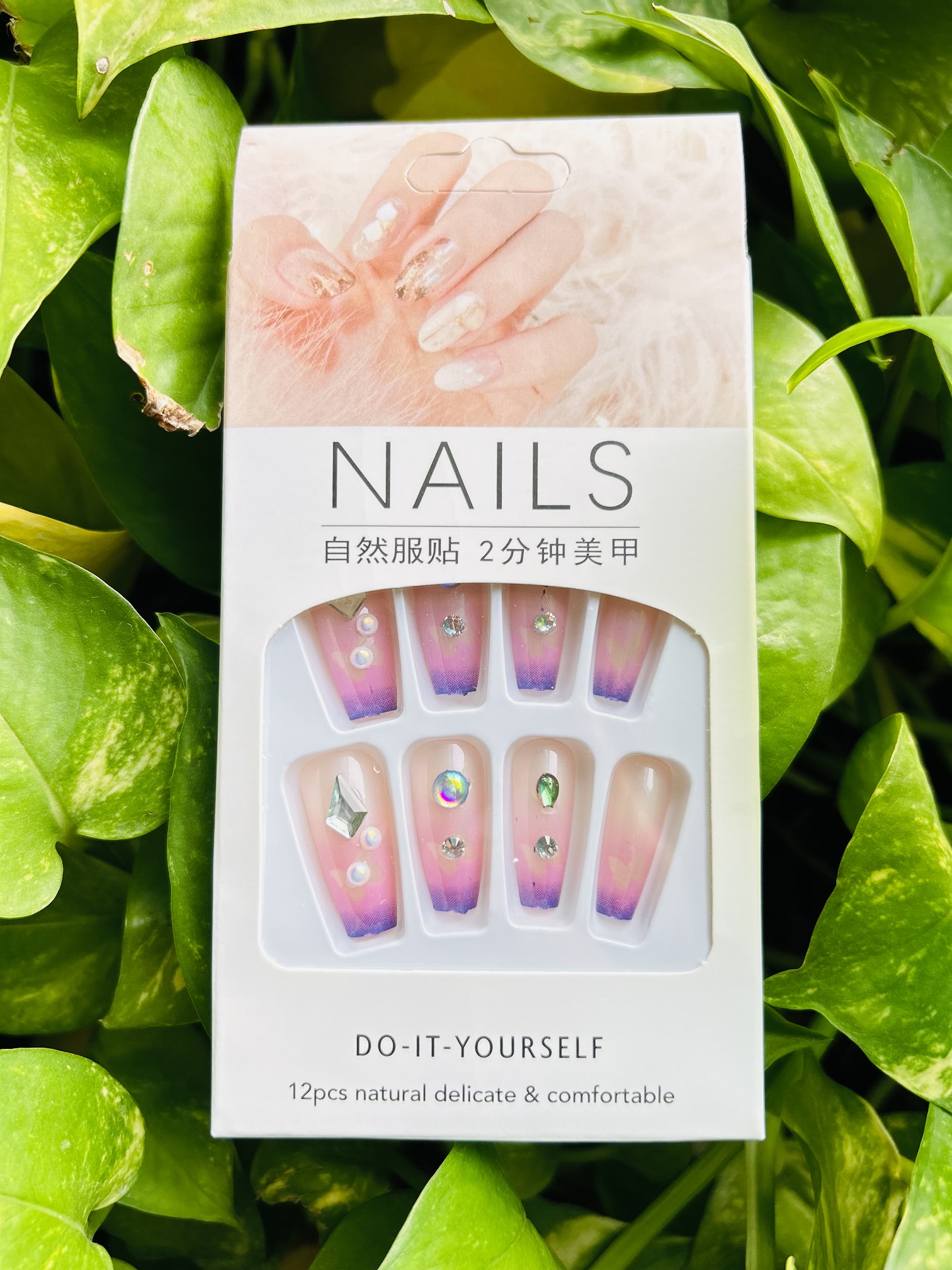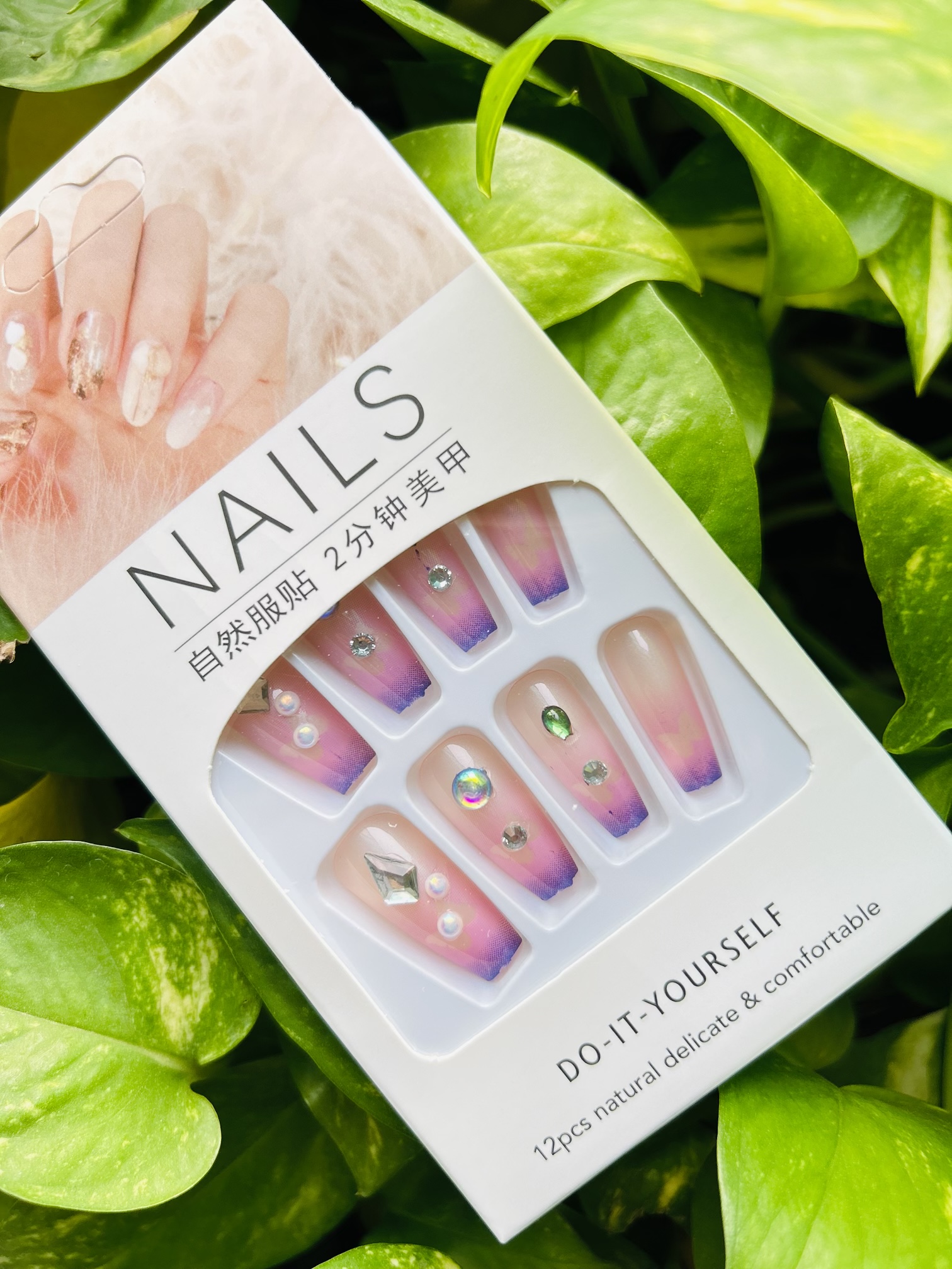 Radiate with the mystical beauty of our ‘Amethyst Glow‘ press-on nails. This captivating set features a stunning ombré that fades from a milky nude to a vibrant violet, reminiscent of a precious amethyst geode. Each nail is adorned with sparkling jewels and delicate pearl accents, creating a luxurious and mesmerizing look that is truly one-of-a-kind.