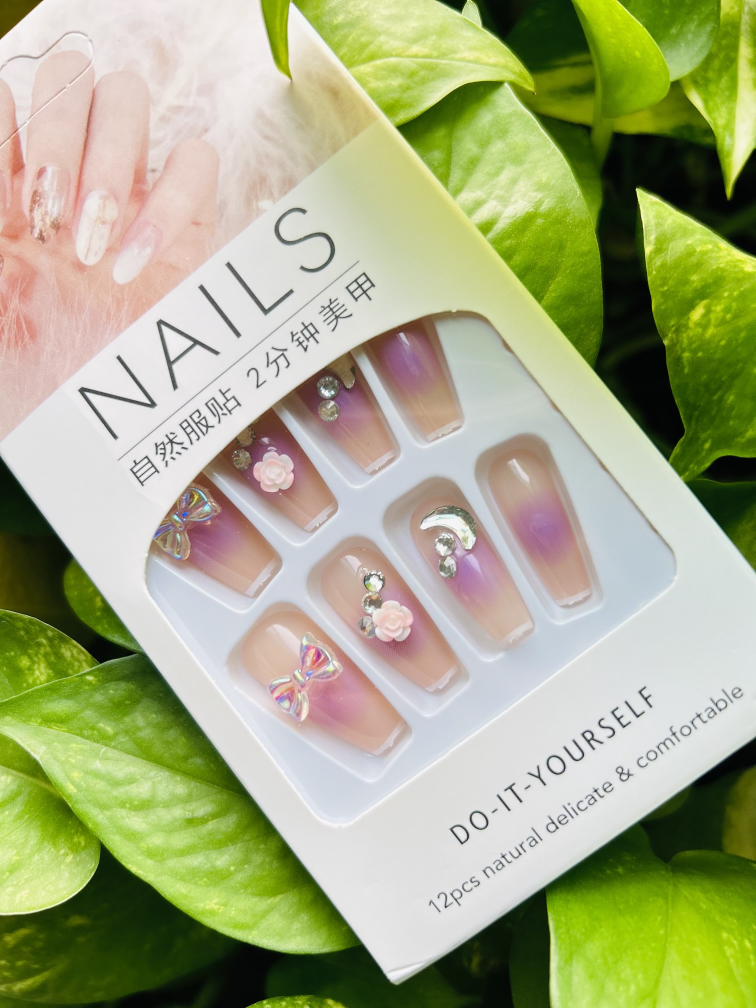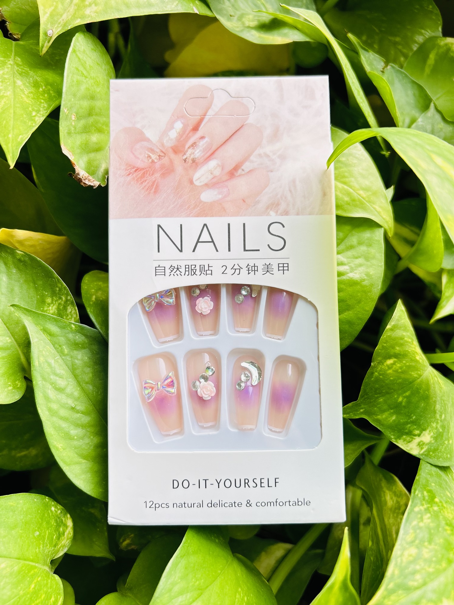 Blooming Grace press-on nails by Aura Jewels is a delicate fusion of soft pastels, sculpted florals, and shimmering accents, inspired by the serene beauty of a blossoming garden.