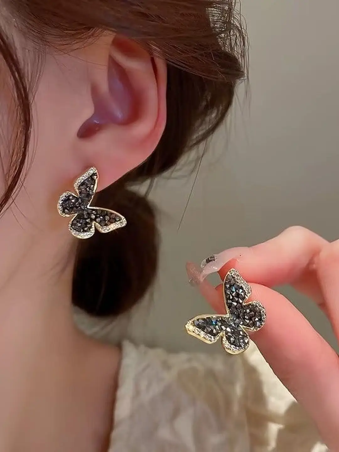 The Midnight Flutter Studs feature butterfly silhouettes encrusted with deep black crystals, outlined in a soft gold finish. Striking yet refined, these earrings add a dramatic sparkle to both day and night looks—perfect for those who love statement elegance with an edge.