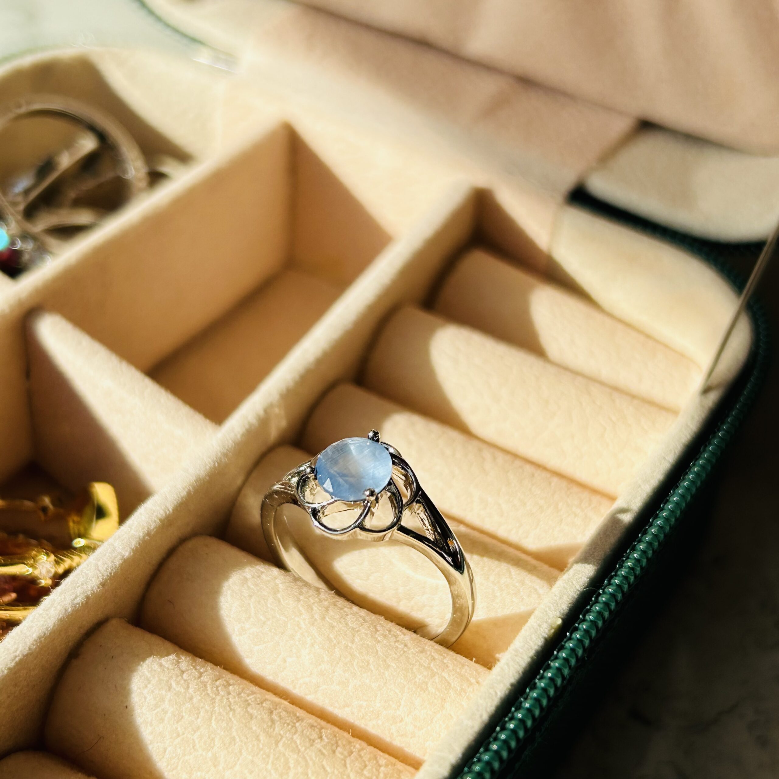 The Moonlit Grace Ring by Aura Jewels features a serene blue stone cradled in a sleek silver finish, symbolising peace, clarity, and quiet elegance. A timeless piece designed to add a soft, graceful charm to your everyday moments.
