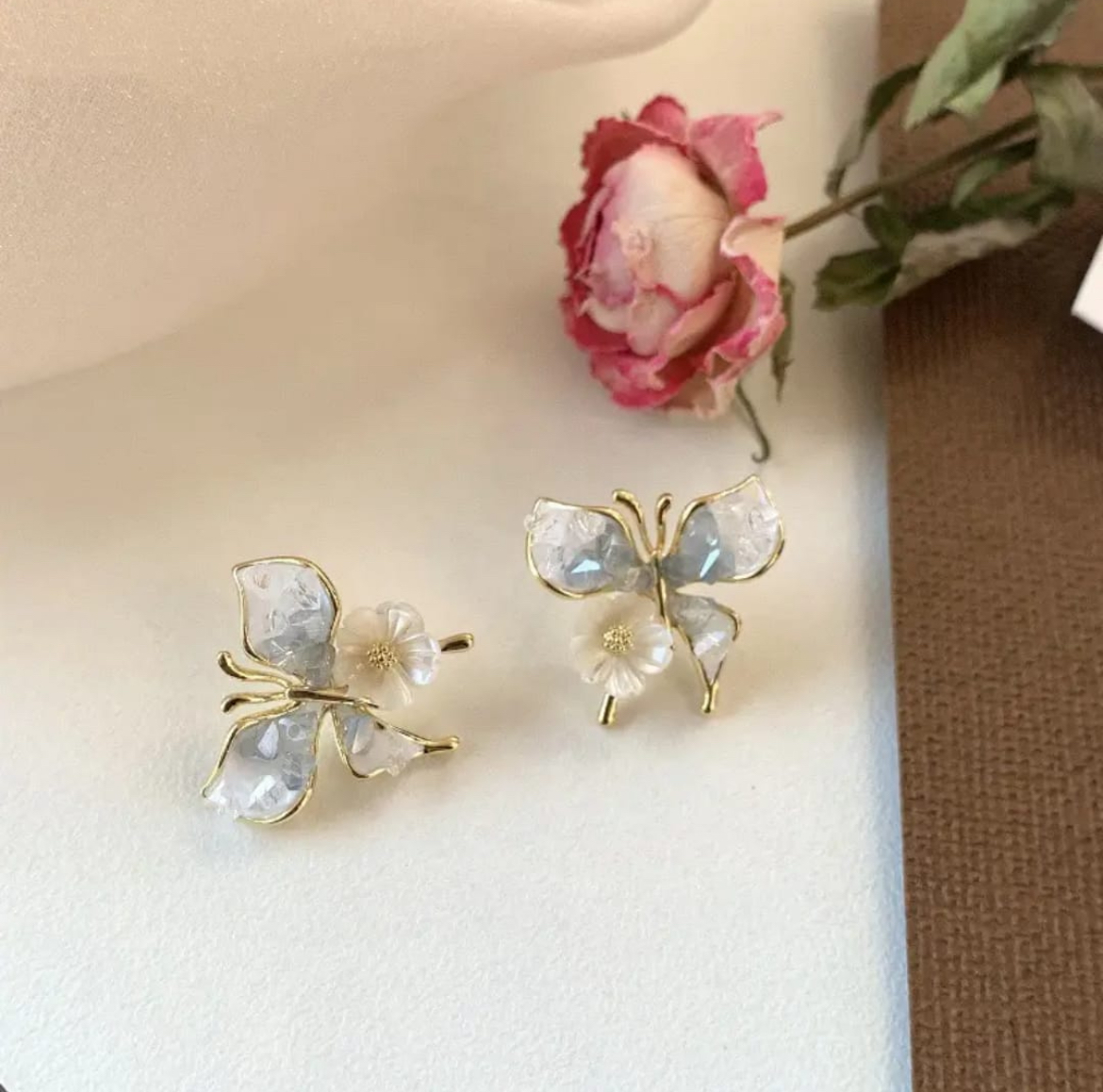Ophelia Earrings by Aura Jewels Capture the essence of spring with these exquisite butterfly earrings. The gold-toned setting holds iridescent, translucent wings and a delicate white flower, creating a whimsical and graceful accessory that’s perfect for any occasion.