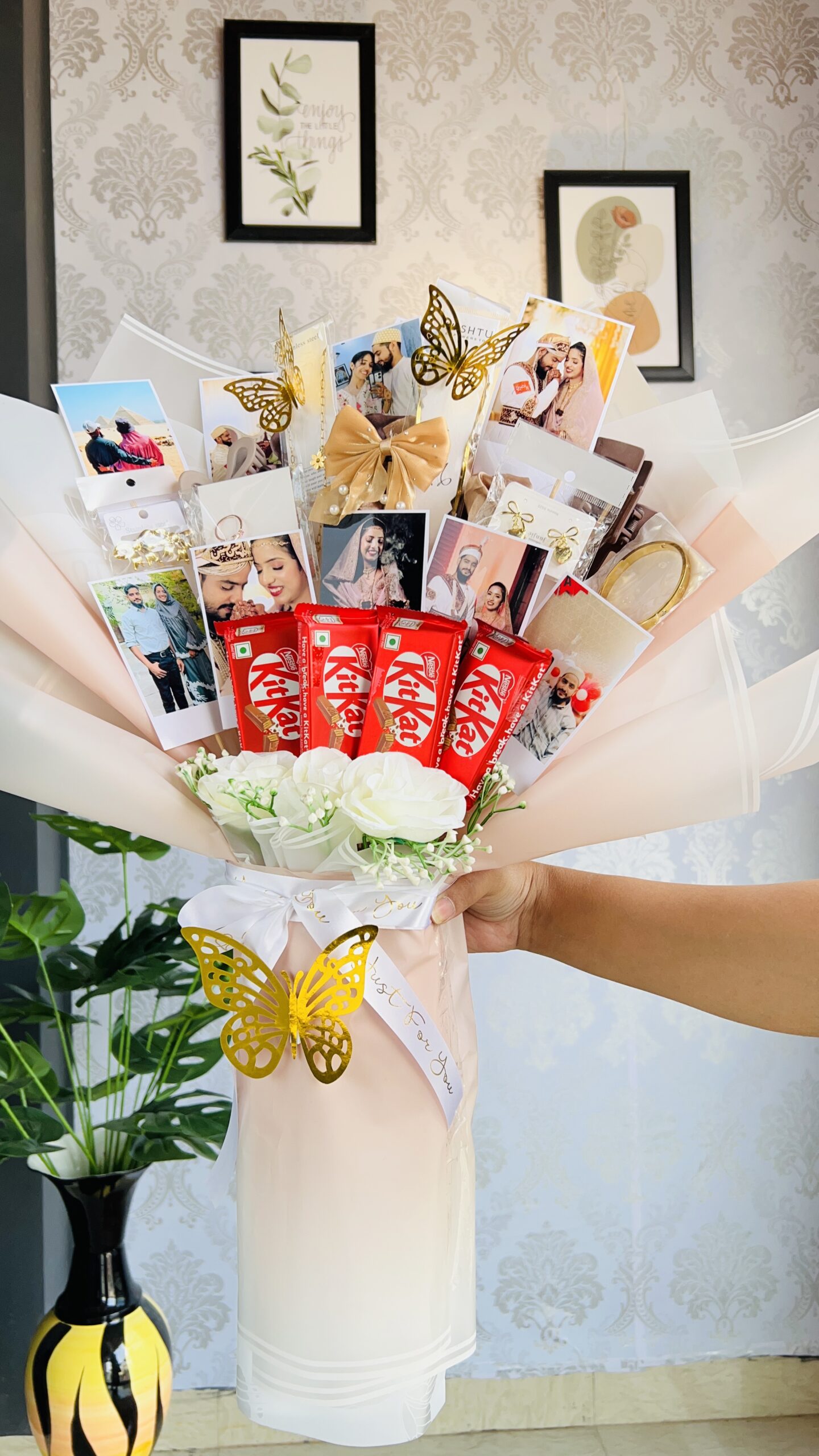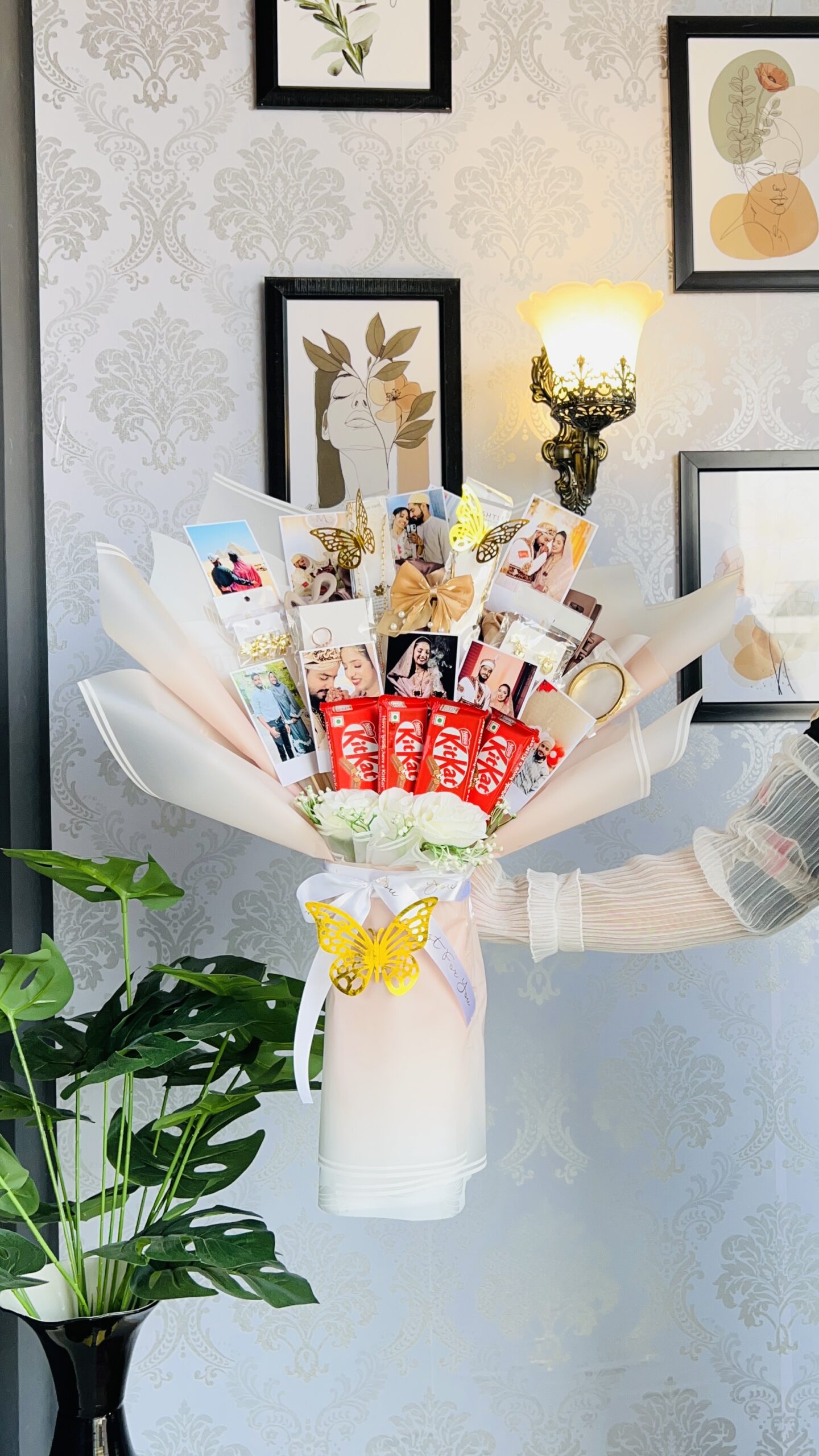 Topped with delicate flowers and sprinkled with golden butterflies, this bouquet is designed to capture love, moments, and memories in the most aesthetic way possible.