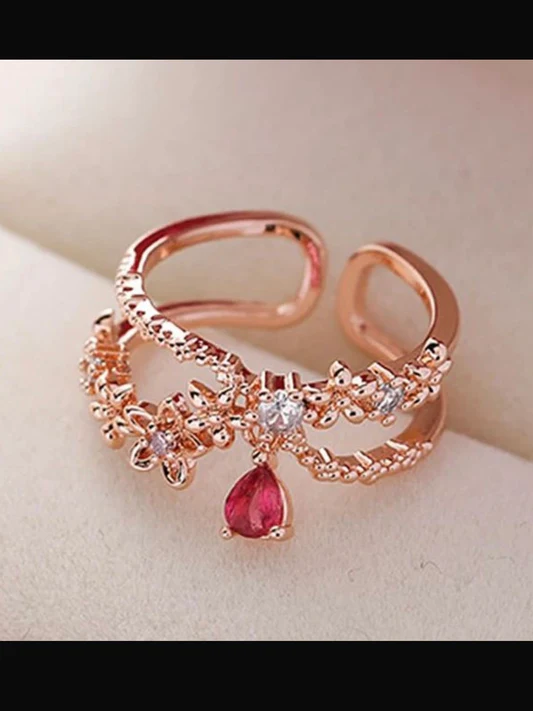 The Rose Dew Blossom Ring features an elegant rose-gold finish adorned with floral detailing, subtle crystal accents, and a graceful ruby-hued drop that adds a touch of romance. Designed to capture femininity and charm, this ring is perfect for those who love timeless elegance with a poetic twist.