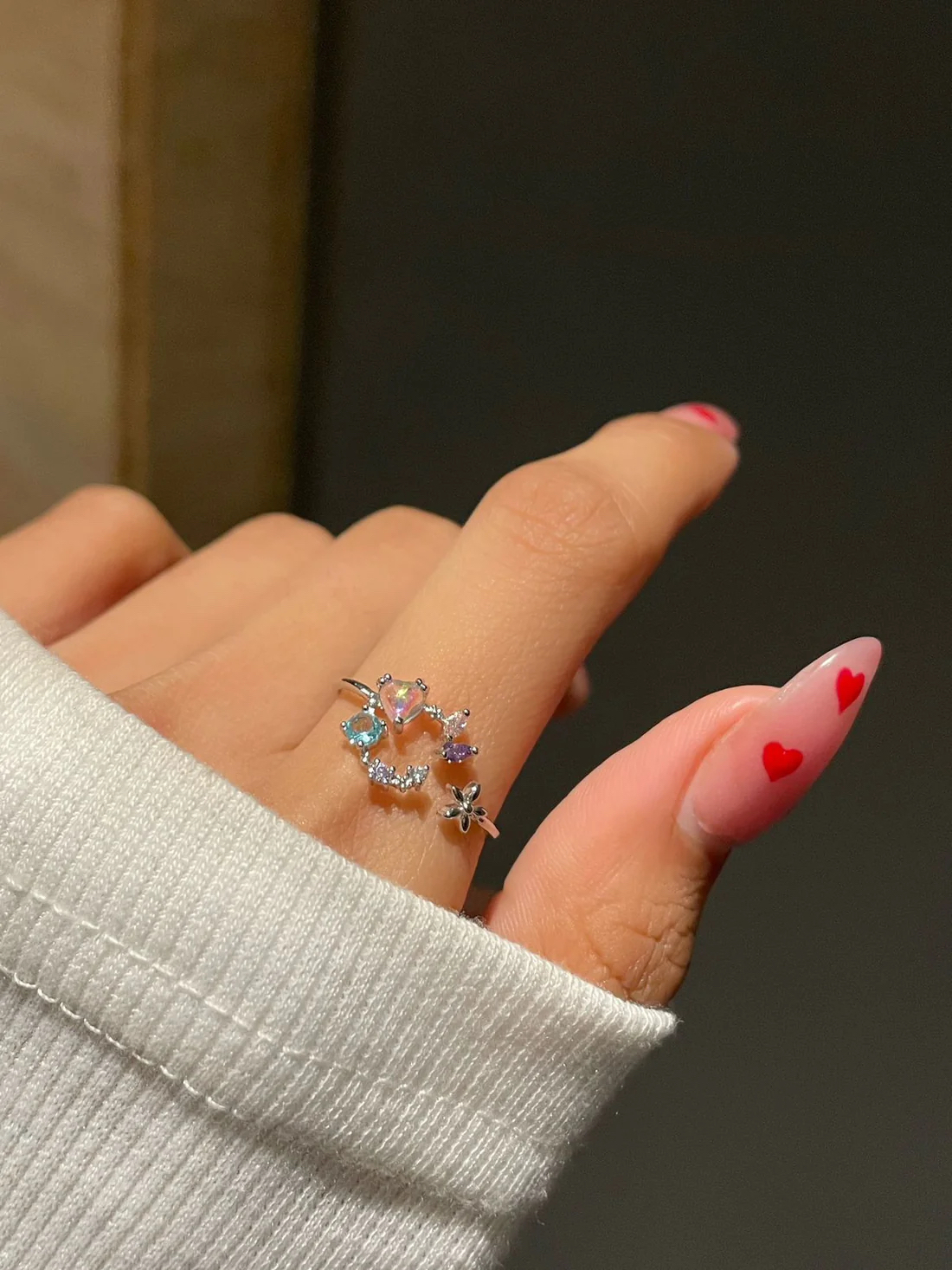 The Starlit Bloom Ring features pastel-hued stones arranged in a whimsical floral silhouette, accented with tiny star details that add a hint of magic. Light, charming, and effortlessly elegant, it’s the perfect piece for those who love subtle sparkle with a touch of fantasy.