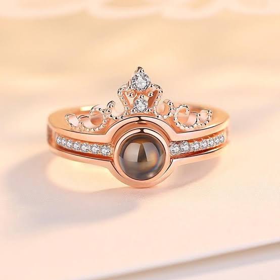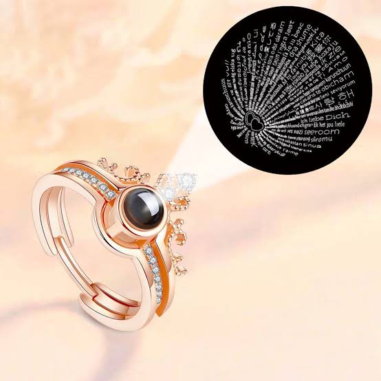 The Whispered Vows Projection Ring by Aura Jewels features a soft rose-gold finish, subtle crystal accents, and a hidden projection that reveals a secret message when light shines through—making it a timeless keepsake meant to be felt, not just worn.